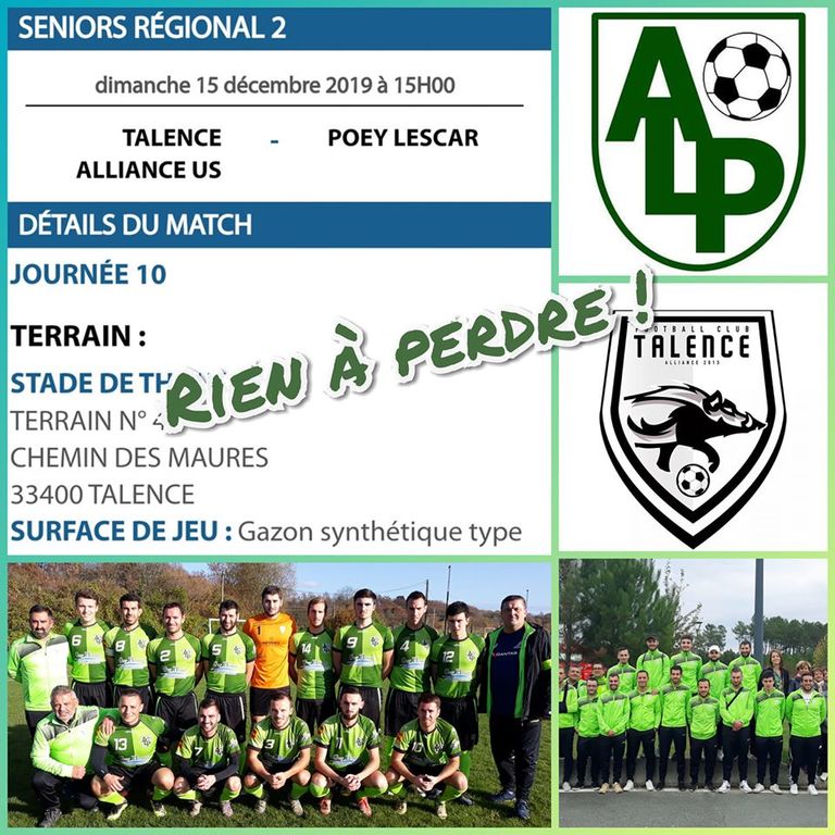 Face à un ogre de la poule, annoncé comme une dreamteam depuis le début de saison, notre équipe première a réalisé un très bon match malgré de nombreux absents.L’entame est clairement pour nous mais l’adversaire va corriger sur les dernières minutes et profiter du K.O subit par Alexis sur une faute grossière non sanctionnée. Moment de vaguement que l’on va payer cash 1-0. Sévère... Étant menés, nos vaillants petits verts vont tout mettre en œuvre pour revenir au score en réalisant une excellente seconde mi-temps et ce sera chose faite par Cédric notre capitaine à 6 minutes du terme. Mérité ! Le plus dur est fait... Et bien non, talence pousse et sur un duel dans la surface, Fabien intervient sans faute mais sur le contact du joueur en retard, le ballon va toucher sa main. L’arbitre pourtant excellent hier, siffle le penalty à notre grande surprise. Main ou pas il y avait bien faute pour nous. 2-1 Scénario cruel et injuste pour notre équipe qui méritait de prendre des points sur ce déplacement. Nos joueurs auraient d’ailleurs mérité des applaudissements et des félicitations de nos adversaires plutôt que des insultes où des gifles distribuées gratuitement après le coup de sifflet final. Nous garderons, malgré le contexte, un comportement exemplaire.Encourageant mais Rageant...